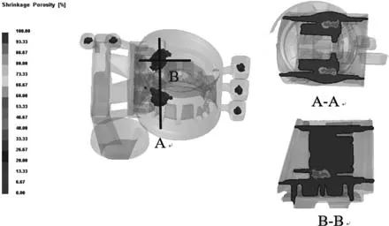 圖7 鑄件完全凝固后的溫度場 圖8為鑄件采用澆注系統I所產生的縮孔、縮松缺陷。鑄件產生缺陷集中的地方是鑄件加強筋壁厚較大的地方,其原因是鑄件在此區域凝固時溫度較高,金屬液凝固較慢,凝固速率不均勻,此時會產生細小的孔洞被孤立,從而在完全凝固時得不到金屬液的補縮,出現縮孔、縮松缺陷。