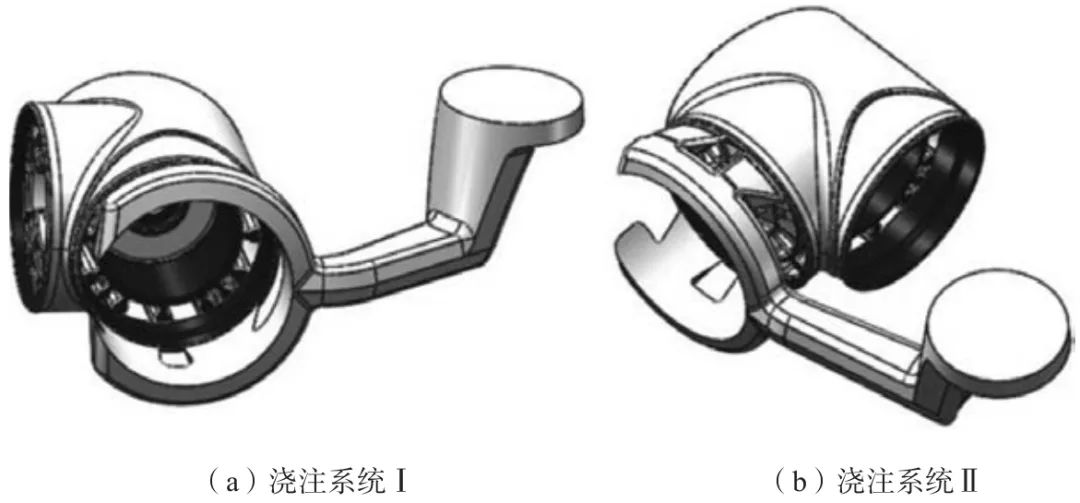 圖3 澆注系統三維示意圖 2.2.1 內澆口設計 內澆口可分為:扁平內澆口、端面側澆口、中心內澆口、環形內澆口等。本殼體屬于圓筒類,為了避免金屬液直接沖擊型芯和粘附現象的產生,兩種澆注系統都采用環形內澆口切向進料,即在鑄件一旁設置環形澆道,金屬液充滿環形澆道后進入型腔,這樣金屬液就可以在環形圓周上得到大致相同的速度,使金屬液充型平穩,型腔內的氣體容易排出。其次也可以在內澆口上設置推桿避免在鑄件上有推桿的痕跡。