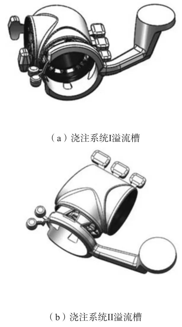 橫澆道是金屬液從直澆道到內澆口的過渡通道,對于不同的壓鑄件橫澆道有不同的結構形式,而對于圓筒類形狀的鑄件,采取圓弧收縮式結構。為了防止金屬液在流動時產生負壓,橫澆道的截面積應逐漸減小。本研究采用臥式冷室壓鑄機,其橫澆道的深度按公式(2)計算。 式中:D為橫澆道深度,mm;T為內澆口厚度,mm。取D=10 mm,由于橫澆道切向進料,橫澆道最小寬度為20 mm,為了便于鑄件更好脫模,設置橫澆道的起模斜度為15°。 2.2.3 直澆道設計 直澆道是金屬液從壓鑄機進入型腔的首要通道,其大小與壓鑄機的壓室直徑有關,本研究壓室直徑選取60 mm,余料厚度設置為10 mm,起模斜度為10°。 2.3?溢流槽的設計 根據設計原則,溢流槽一般設置在金屬液匯合、型腔附近難以排氣的地方。本鑄件上下分型,故在分型面處會有金屬液匯合,因此對于兩種澆注系統都需要在分型面處設置溢流槽;其次為了防止環形澆道的金屬液發生回流,兩種澆注系統都需在環形澆道兩邊各設置一個溢流槽。而由圖2b可知,鑄件正前方壁厚較厚,為充分排除氣體和夾雜,故對澆注系統I,在左右兩側各設置1個溢流槽。澆注系統I、II溢流槽三維示意圖分別如圖4a、b所示。