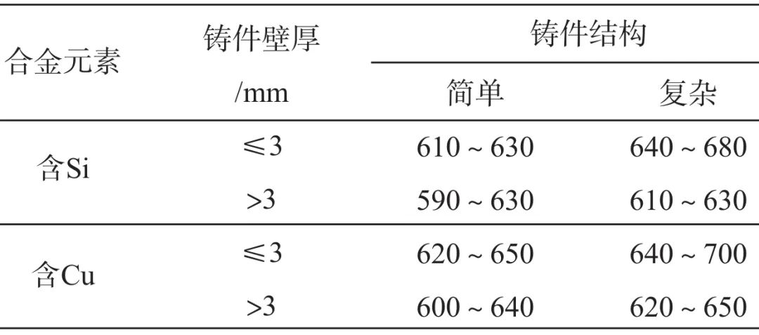 圖4 溢流槽三維示意圖 3.數值模擬與優化 將三維造型導入模擬軟件ProCAST中進行網格劃分,設置鑄件網格單元尺寸為2 mm,模具網格單元尺寸為10 mm。 3.1?工藝參數的設置 設置模擬工藝參數:(1)鑄件材料為歐洲標準的ENAC-41600(YL113),模具材料為H13;(2)金屬液澆注溫度推薦值如表2所示,本研究取620 ℃,模具預熱溫度為220 ℃;(3)模具與鑄件的傳熱系數為1 000 W/(㎡ ·K);(4)金屬液的充填速度為3 m/s,鑄件采用空冷方式冷卻。
