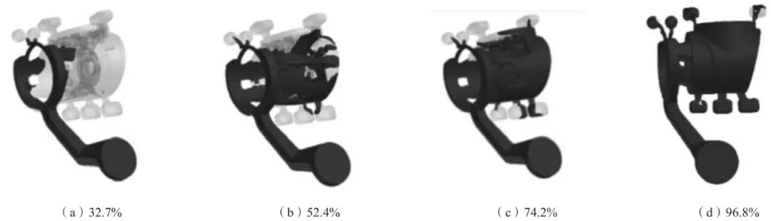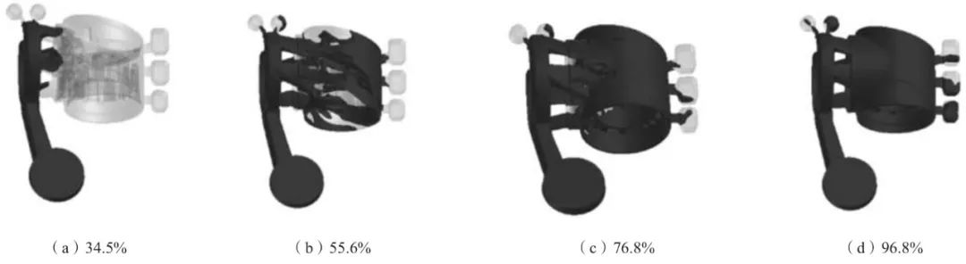 圖5 澆注系統I充型過程示意圖 圖6為澆注系統II的充型過程。由圖知,當充型34.5%時,金屬液開始從環形內澆口流向鑄件;充型55.6%時,金屬液從四個方向流向鑄件的端部,少量金屬液開始流向溢流口;充型76.8%時,鑄件輪廓幾乎充型完成,金屬液流向溢流槽;充型96.8%時,金屬液充填溢流槽,儲存冷污金屬液。整個充型過程,金屬液流動平穩,無飛濺現象,金屬液從環形內澆口流向鑄件,最后充填溢流槽,金屬液流向正確,澆注系統II設置合理。