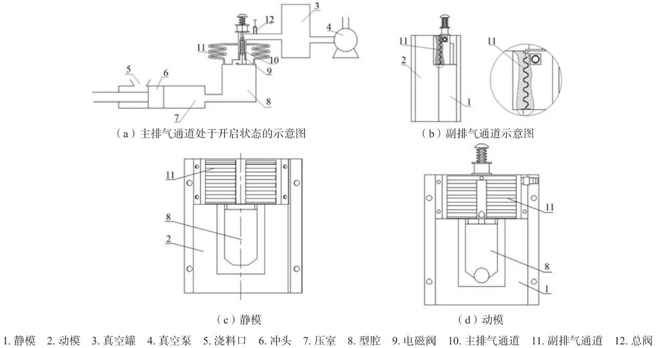 ![]() 原標題:鎂合金壓鑄真空抽氣系統的設計與應用研究 摘要:設計了一種含有主、副排氣通道的真空抽氣系統,主排氣通道較副排氣通道橫截面大,由真空閥控制其開閉,副排氣通道采用橫截面較小的齒狀排氣通道,在真空壓鑄過程中保持全程抽氣。研究表明:采用主、副排氣通道的真空抽氣系統,能夠獲得外觀完整、組織致密的鎂合金真空壓鑄件,氣孔率比齒狀排氣通道壓鑄件減少48%,T6熱處理后氣泡減少60%,鑄件的抗拉強度、屈服強度和伸長率分別提高9.3%、10.2%和21.4%。 真空壓鑄技術是在傳統壓力鑄造技術的基礎上輔以對型腔抽真空的技術?,F行的真空壓鑄技術中,抽真空的方式主要有三種:第一種是當壓射沖頭越過澆口,碰到行程開關,型腔及壓室接通真空源,氣體被抽出,壓射沖頭繼續前進,快速壓射前,靠行程開關或時間繼電器關閉真空閥,停止抽氣,沖頭快速壓射,完成液態金屬成形,這種方法也稱半過程排氣;第二種是用“搓衣板”形冷卻塊,也稱“齒狀排氣道”進行全過程排氣,即排氣通道像兩個合起來的搓衣板樣形狀,液態金屬在充滿型腔后被擠入齒狀排氣道縫中凝固,終止排氣;第三種是瑞士方達瑞公司推出的雙芯真空閥的真空壓鑄系統,它是全過程排氣,閥門在型腔尾部,在金屬液充滿型腔到達閥門時,依靠金屬液流動慣性力將真空閥關閉。不難看出,第一種方式液態金屬到達型腔入口停止排氣,殘留一部分氣體未排掉;第二種方式排氣道是彎曲的窄縫,排氣管道長,盡管是全過程排氣,也很難把氣體充分排掉;第三種方法能全過程充分排氣,也無第二種方法所凝固在齒狀排氣道中的廢料,是目前比較理想的方法,但真空閥從得到關閉閥門信號,到閥門完全關死,時間極短,以毫秒計算,閥門一次性成本高,要定期進行維護,維護費用也較高,對使用人員素質要求也高,這些因素限制了該系統在真空鑄造中的廣泛應用。 針對現行真空壓鑄中真空系統所采用的半過程排氣方法存在殘留氣體多、齒狀排氣道排氣能力低以及全過程排氣真空閥成本高的現狀提出的一種新的抽真空方法。該方法是采用主、副排氣通道同時對型腔進行抽氣,即半過程排氣和齒狀全過程排氣兩者并用,此方法克服半過程排氣殘留氣體多和齒狀排氣道排氣速度慢的缺點,能夠有效地提高型腔真空度,獲得組織致密的壓鑄件。 1.真空抽氣系統 含有主、副排氣通道的真空抽氣系統由主排氣通道、齒狀副排氣通道、真空罐、真空泵和模具型腔等組成,如圖1所示。該真空抽氣系統的工作原理:總閥12關閉,真空泵4將真空罐3抽成具有一定真空度的待用狀態,電磁閥9處于開啟狀態,通過澆料口將定量金屬液倒入料筒,啟動壓射沖頭6,當壓射沖頭越過澆料口5并觸動感應開關時總閥12打開,這時副排氣通道11和主排氣通道10同時對與壓室、真空罐連成一起的型腔進行抽氣,當壓射沖頭推動金屬液體向前運動,觸動快壓射感應開關,電磁閥9靠電磁力快速向下運動關閉主排氣通道,而副排氣通道11繼續對型腔進行抽氣直到液態金屬充滿型腔并進入齒狀副排氣道的窄縫而冷卻凝固,最后獲得真空壓鑄件,其結構見圖1。
