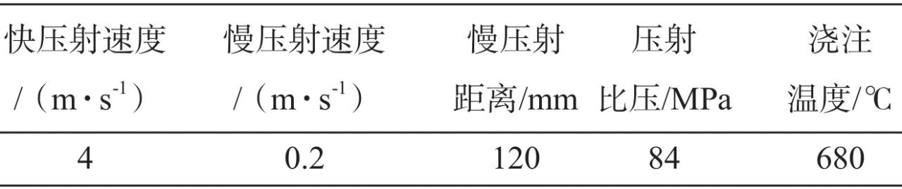 圖2 散熱器模型與模具結構圖 3.試驗驗證 3.1 試驗設計 根據AZ91D鎂合金的特點,通過前期的試驗驗證,選擇的壓鑄工藝參數如表2所示。本試驗在400 t的壓鑄機上進行,試驗中通過對真空電磁閥的控制從而實現主排氣通道的開閉,為了保證主排氣通道不被金屬液堵住,根據理論計算及前期試驗分析得出抽氣時間應控制在0.6 s以內,副排氣通道則無嚴格時間要求。關閉真空電磁閥則副排氣通道隨之關閉,只保留主排氣通道(齒狀排氣通道),便于進行對比試驗。