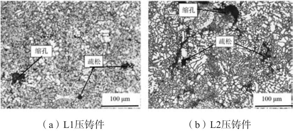 表3 壓鑄件力學性能 由試驗L1、L2制取的散熱片金相試樣經粗磨、細磨、拋光,用3%的硝酸酒精水溶液腐蝕后,在光學顯微鏡下觀察與分析其顯微組織,見圖5。由圖5分析可知,兩種壓鑄條件下制得的散熱器壓鑄件都存在不同程度的縮孔、疏松缺陷。與試驗L2壓鑄件相比,試驗L1壓鑄件的氣孔尺寸和氣孔數量都大幅度降低,氧化夾雜缺陷得到明顯改善,按面積算,其縮孔、疏松量降低48%以上,鑄件偏析程度減小,金屬液充型阻力明顯減少,易獲得組織較為致密的成品。