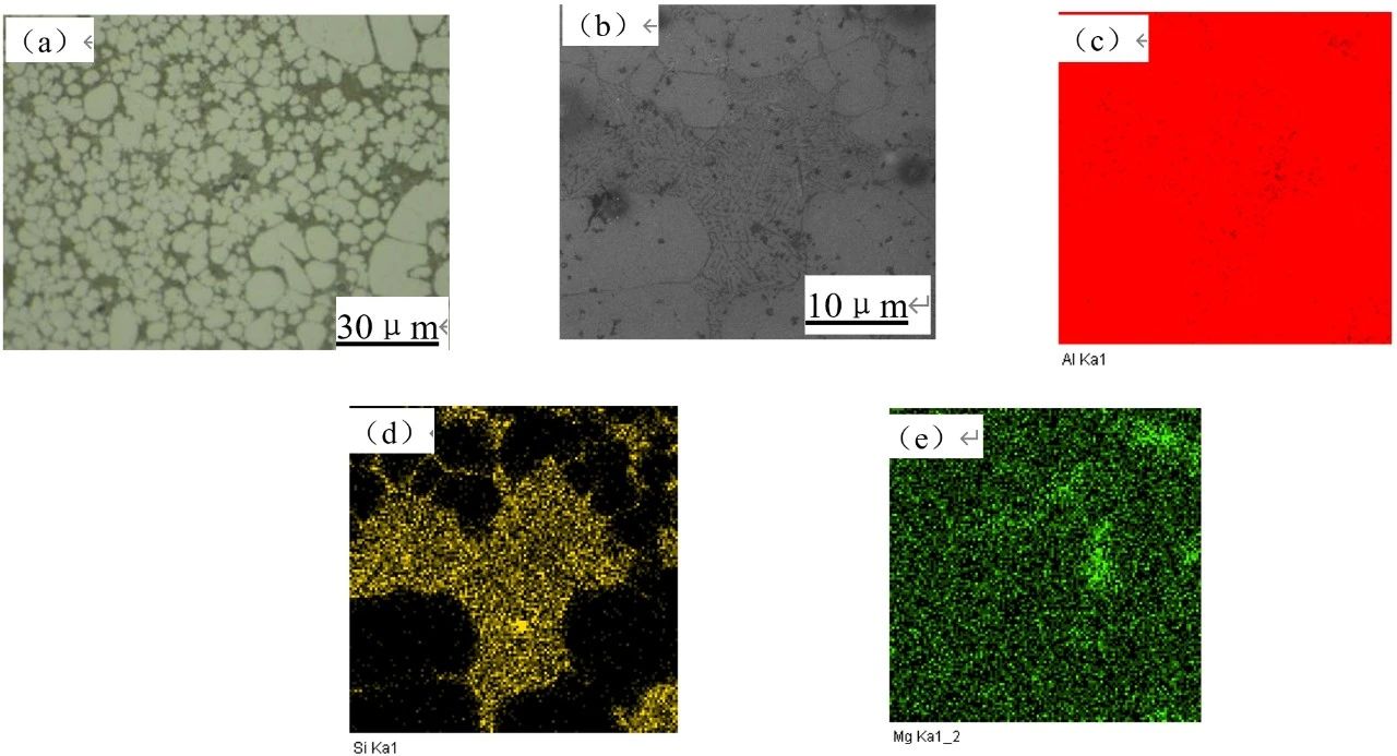 圖6 140℃時效后Al-Si-Mg-Cu合金的微觀組織和元素分布:(a)金相照片(b)SEM照片(c)Al元素分布(d)Si元素分布(e)Mg元素分布 圖6為140℃ 時效后Al-Si-Mg-Cu 合金的微觀組織和元素分布??梢杂^察到時效后的微觀組織主要還是初生α-Al和共晶Si相,對比圖3b,發現時效對于初生α-Al的形貌大小基本沒有影響,都是由細小的α-Al枝晶和少數粗大的α-Al枝晶組成。通過SEM分析可以發現(圖6b),在α-Al出現了一些彌散分布的黑色組織,經EDS分析(圖6c、圖6e),此組織主要由Al與Mg組成,結合胡祖麒等的研究,Al-Mg-Si系合金生成的β-Al8Mg5相經過時效處理后會重新固溶到鋁基體中,起到固溶強化的作用,分析此組織β-Al8Mg5相。 對時效后的組織進行了EDS分析,見圖7。從圖7a可見,在共晶Si中間有一圈灰色的環狀組織,組織主要構成元素為Si和Mg,分析認為是Mg2Si相;在圖7a左上角和正中間位置還存在形狀不規則的灰色組織,通過圖7b的EDS分析(Mg摩爾分數為4.24%,Cu摩爾分數為1.10%)和元素分布圖,發現該組織由Al、Mg、Si、Cu組成,且Mg與Cu摩爾比為4:1,因此判斷該組織為Al5Mg8Cu2Si6相。在壓鑄時,Mg、Cu等元素由于含量較少能夠完全溶解于基體中,經過時效處理,溶解于基體的強化相析出起到彌散強化的作用。Zn在鋁中有很大的溶解度,因此Zn主要起固溶強化的作用。綜上所述,時效處理后的合金組織主要有細小的α-Al、均勻分布的鈍化共晶Si、彌散分布的Mg2Si相和少量的Al5Mg8Cu2Si6相組成。