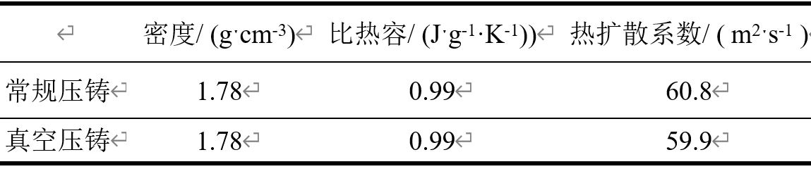 表4 常規(guī)壓鑄與真空壓鑄條件下的密度,比熱容,熱擴散系數(shù)