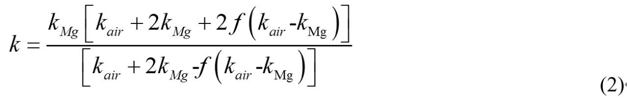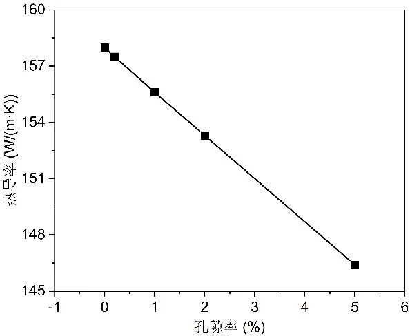 式中,k為含孔隙純Mg的熱導率;Kair為空氣熱導率;f為孔隙率;KMg為純Mg熱導率,取158 W/(m·K)??諝庀啾孺V合金的熱導率,相差6個數(shù)量級,因此,氣孔對熱量在合金中傳輸?shù)挠绊懀瑤缀跏亲钄嘈缘?。圖6為依據(jù)式(2)推算出純鎂熱導率隨孔隙率變化規(guī)律,可見每增加1%的孔隙率,熱導率降低2.3 W/(m·K)。然而,相比多孔材料,在壓鑄件中,孔隙率往往很低,一般不超過3%。真空壓鑄相比常規(guī)壓鑄,不僅僅是孔隙率降低,溶質原子濃度也提升,晶粒更細小??紫堵氏啾裙倘茉?,對熱導率的影響相比,幾乎可以忽略不計。所以,真空壓鑄盡管可以降低合金中的孔隙率,但綜合來看,并不一定會導致熱導率提升。