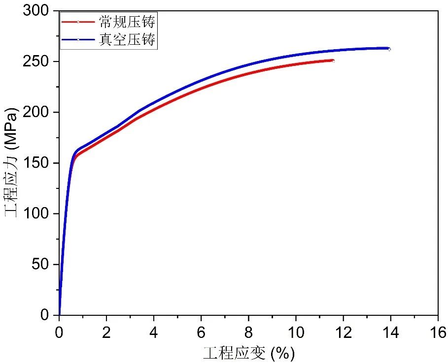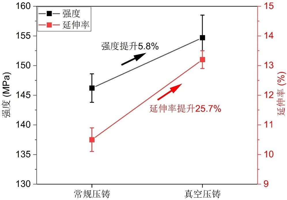 圖6 基于復合材料導熱模型的純鎂熱導率隨孔隙率變化規(guī)律 2.3 真空壓鑄對LA42合金力學性能的影響 圖7為常規(guī)壓鑄與真空壓鑄的拉伸曲線和力學性能。可以看出,真空壓鑄相比常規(guī)壓鑄,屈服強度由146.2 MPa提高至154.7 MPa,提升率約5.8%,伸長率由10.5%提高至13.2%,提升率約25.7%,其強度差異可以歸結到不同的強化方式上。在鑄造合金中,主要強化方式包括晶界強化、固溶強化、第二相強化。