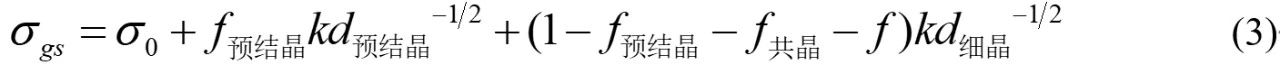 (b)力學性能對比 圖7 常規(guī)壓鑄與真空壓鑄條件下LA42合金的拉伸曲線和力學性能 首先,晶界強化,主要由細小的等軸晶和粗大的預結晶組織提供,因此,傳統(tǒng)的晶界強化公式Hall-Petch可以轉變?yōu)椋?/p>