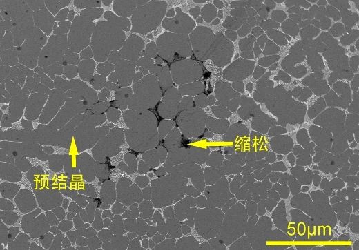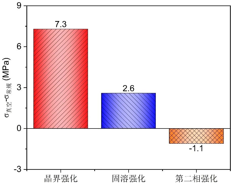 式中,бsp是第二相強化貢獻;Vsp是第二相體積分數(shù);бeutectic是共晶相屈服強度。分別計算常規(guī)壓鑄與真空壓鑄第二相強化貢獻,求得其差值,為-1.1 MPa,見圖8。 從圖8可以清晰地發(fā)現(xiàn),真空壓鑄與常規(guī)壓鑄在強度上的差異主要由晶界強化導致。晶界強化的差異主要取決于預結晶分數(shù)和細小等軸晶分數(shù)的差異。常規(guī)壓鑄的預結晶分數(shù)幾乎是真空壓鑄的10倍,而真空壓鑄的細小等軸晶分數(shù)遠高于常規(guī)壓鑄。同時,兩種壓鑄工藝的細小等軸晶尺寸相差不大。因此,主要是常規(guī)壓鑄的大量粗大預結晶組織顯著削弱了晶界強化效果,從而造成了真空壓鑄和常規(guī)壓鑄的強度差異。