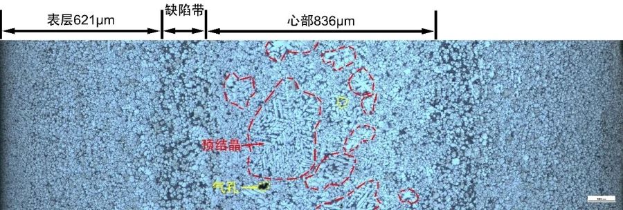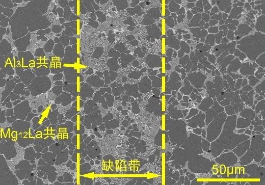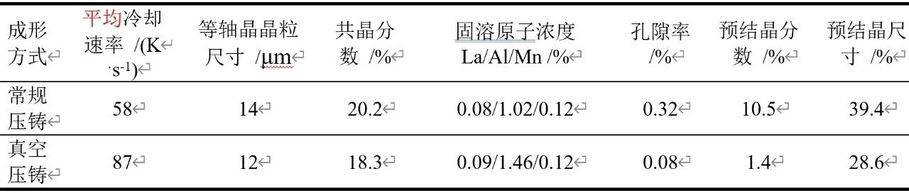 采用Zwick/Roell拉伸試驗機,在室溫下以0.5 mm/min的拉伸速率對拉伸棒進行拉伸試驗。利用LFA-467激光導熱儀測量樣品的熱擴散系數(shù),使用密度計(Sartorius Quintix124-1CN)對樣品的常溫密度進行測試,通過Neumann-Kopp定律計算獲得樣品的比熱容。試樣的熱導率可以由下式獲得: 對試樣進行機械研磨、拋光和用鎂合金專用蝕刻劑(4 mL硝酸和96 mL乙醇)腐蝕5 s后,采用光學顯微鏡(Zeiss Axioscope 5)沿壓鑄件厚度方向進行微觀組織分析;采用搭載EDS的Hitachi SU-70掃描電鏡在至少10個基體區(qū)域測量固溶度;采用Image Pro Plus測量共晶體積分數(shù);采用智鑄超云云平臺獲取常規(guī)壓鑄和真空壓鑄的冷卻速率曲線,求得對應的平均冷卻速率。 2、試驗結果及分析 2.1 微觀組織 圖2為LA42鑄件沿厚度方向的金相組織??梢姵R?guī)壓鑄和真空壓鑄沿厚度方向的金相組織,均呈現(xiàn)典型的“三明治”結構。該“三明治”組織主要由3個區(qū)域組成,區(qū)域1是靠近模具內表面的表層區(qū),區(qū)域2是鑄件中間的心部組織區(qū),區(qū)域3是表層區(qū)和心部之間的缺陷帶。圖3為常規(guī)壓鑄沿厚度方向3個區(qū)域的SEM高倍組織。圖3a為表層組織,可見晶粒細小,呈現(xiàn)典型的等軸晶狀態(tài),平均晶粒尺寸約為14μm。圖3b為缺陷帶組織,出現(xiàn)發(fā)達的共晶區(qū)域,絕大部分共晶組織由α-Mg+Al3La組成,少部分由α-Mg+Mg12La組成。圖3c為心部組織,含有大量粗大的預結晶組織,呈現(xiàn)枝晶形貌,枝晶間隙伴有縮松。對比圖2a和圖2b,可見真空壓鑄和常規(guī)壓鑄的組織存在顯著差異,具體參數(shù)見表3。常規(guī)壓鑄的表層組織薄,大為約621 μm,心部伴有大量預結晶組織,占整個厚度方向組織約10.5%,平均尺寸約為39.4 μm;而真空壓鑄的表層組織厚,大約為807 μm,心部的預結晶組織僅占整個厚度方向組織的1.4%,平均尺寸約為28.6 μm。
