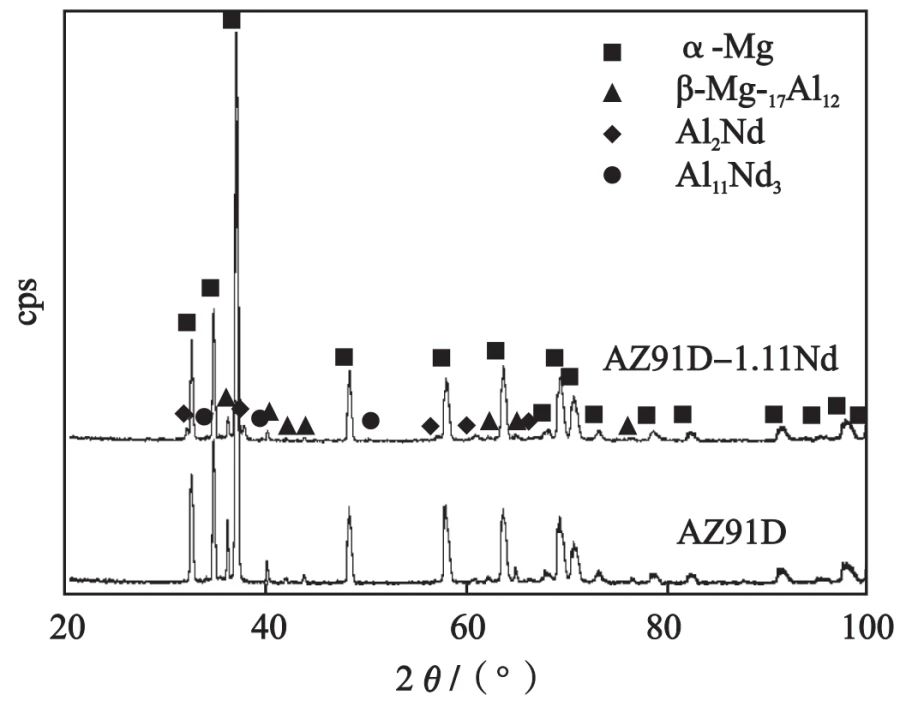 圖1 壓鑄試樣及兩種合金的壓鑄流動試樣對比 采用等離子體原子發(fā)射光譜儀(ICP)分析合金中Nd含量為1.11%。金相試樣從壓鑄拉伸試樣相同部位切取,腐蝕劑選用5%硝酸酒精,接著在Leica DMI 3000M型光學金相顯微鏡(OM)及JEOL HXA-8100型掃描電子顯微鏡(SEM)上進行顯微組織和EDS分析;在采用銅靶的SmartLab型 X 射線衍射儀(XRD)上進行物相分析。采用DNS200 型萬能材料試驗機進行室溫和高溫(423 K)拉伸試驗,進行高溫拉伸試驗前試樣在該溫度保溫10 min,拉伸速度2 mm/min;采用 MH-5L型顯微硬度儀進行顯微維氏硬度(HV)測試,載荷9.8 N,加載時間20 s;采用DRPL-2C型熱導(dǎo)率測試儀測試導(dǎo)熱性能;測量流動試樣長度來表征合金的流動性能。 2、試驗結(jié)果與討論 2.1?顯微組織 圖2為AZ91D與AZ91D-1.11Nd合金壓鑄試樣的X射線衍射圖譜。可見,AZ91D合金壓鑄態(tài)XRD譜主要由α-Mg和β-Mg17Al12兩種相峰組成,而AZ91D-1.11Nd壓鑄態(tài)XRD譜除出現(xiàn)上述α-Mg、β-Mg17Al12相的峰之外,還出現(xiàn)Al2Nd和Al11Nd3新相的峰,但沒有出現(xiàn)Mg-Nd二元相或Mg-Al-Nd三元相的峰。