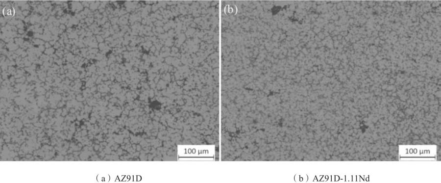 圖2 壓鑄態(tài)AZ91D與AZ91D-1.11Nd合金的X射線衍射圖譜 圖3為AZ91D與AZ91D-1.11Nd合金壓鑄試樣的金相照片。可見,AZ91D合金的微觀組織主要由白色的α-Mg基體和灰色、呈網(wǎng)狀沿晶界分布的β-Mg17Al12組成,平均晶粒尺寸約38 μm。添加1.11%Nd后,晶粒有所細化,平均晶粒尺寸降至約23 μm。