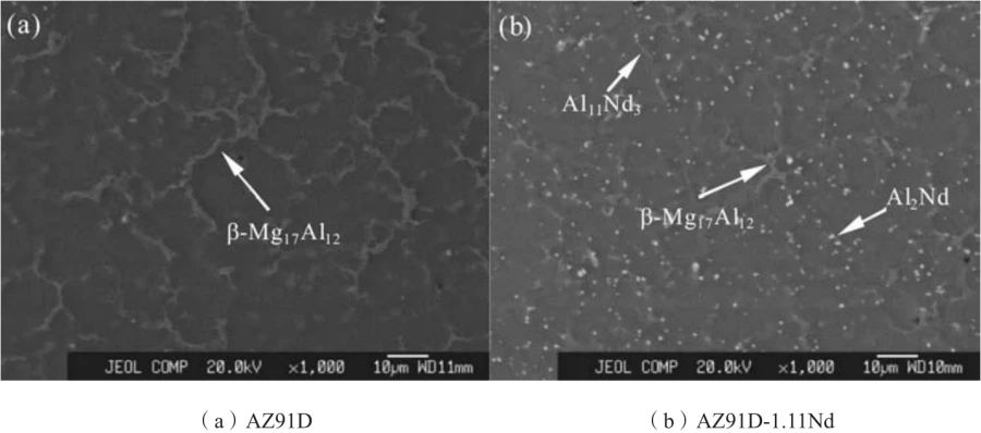 圖3 壓鑄態(tài)AZ91D與AZ91D-1.11Nd合金的金相照片 圖4為AZ91D和AZ91D-1.11Nd合金壓鑄試樣的SEM照片。可見,AZ91D合金的微觀組織主要由黑色α-Mg基體和灰色β-Mg17Al12組成,β-Mg17Al12呈網(wǎng)狀沿晶界分布。AZ91D-1.11Nd合金的微觀組織主要由黑色α-Mg基體、灰色β-Mg17Al12和大量亮色的粒狀和少量針狀相組成,β-Mg17Al12呈網(wǎng)狀沿晶界分布,亮色細小顆粒狀和針狀相在晶界和晶粒內(nèi)彌散分布,網(wǎng)狀的β-Mg17Al12被打斷且粒徑減小。