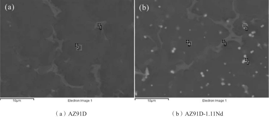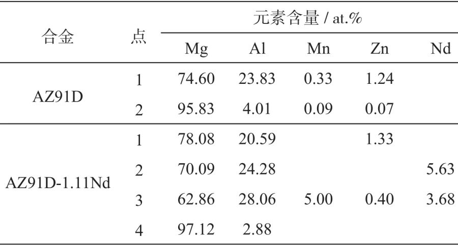 圖4 壓鑄態(tài)AZ91D與AZ91D-1.11Nd合金的掃描電鏡照片 圖5通過EDS標記了兩種合金不同相位置的點對第二相粒子分析,結(jié)果如表1所示。基體中沒有檢測到Nd,亮色相中檢測到Nd存在,AZ91D-1.11Nd合金基體中固溶元素含量低于AZ91D。結(jié)合XRD分析結(jié)果及相關(guān)文獻可知亮色顆粒狀相主要為Al2Nd,針狀相為Al11 Nd3。Nd、Mg和Al的電負性分別為1.14、1.31和1.61,Nd與Mg、Al之間的電負性差值分別為0.17和0.47,因此Al和Nd之間的電負性差值更大,加入Nd后在熔體凝固過程中Al-Nd相會優(yōu)先析出,抑制了低熔點β-Mg17Al12的析出,同時β-Mg17Al12的體積及粒徑減小。