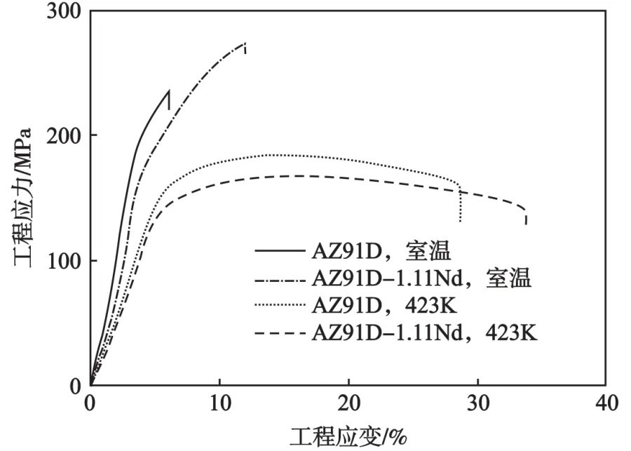 圖6 壓鑄態(tài)AZ91D與AZ91D-1.11Nd合金的室溫和高溫拉伸工程應(yīng)力-應(yīng)變曲線