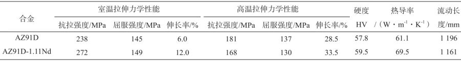 表1 壓鑄態(tài)AZ91D與AZ91D-1.11Nd合金的能譜掃描分析結(jié)果 2.2?壓鑄態(tài)性能 圖6為壓鑄態(tài)AZ91D與AZ91D-1.11Nd合金的室溫和高溫拉伸工程應(yīng)力-應(yīng)變曲線,其拉伸力學性能結(jié)果列于表2中。可以看出,壓鑄態(tài)AZ91D合金室溫抗拉強度238 MPa,屈服強度145 MPa,伸長率6%,而AZ91D-1.11Nd合金室溫抗拉強度272 MPa,屈服強度149 MPa,伸長率12%,與AZ91D合金相比分別提升14%、3%和100%,室溫拉伸性能優(yōu)于AZ91D合金,但是423 K高溫拉伸強度低于AZ91D。AZ91D-1.11Nd合金晶粒尺寸小于AZ91D合金,晶粒越小,對應(yīng)體積的晶界越多,位錯運動的障礙也越多,合金的強度就越高;而且Al 2 Nd和Al 11 Nd 3 在晶界和晶粒內(nèi)彌散分布,能夠阻止位錯運動,提高合金強度。另外,3~30 μm范圍晶粒尺寸的鎂合金通常具有更好的塑性,所以AZ91D-1.11Nd合金室溫和高溫均有更好的塑性。