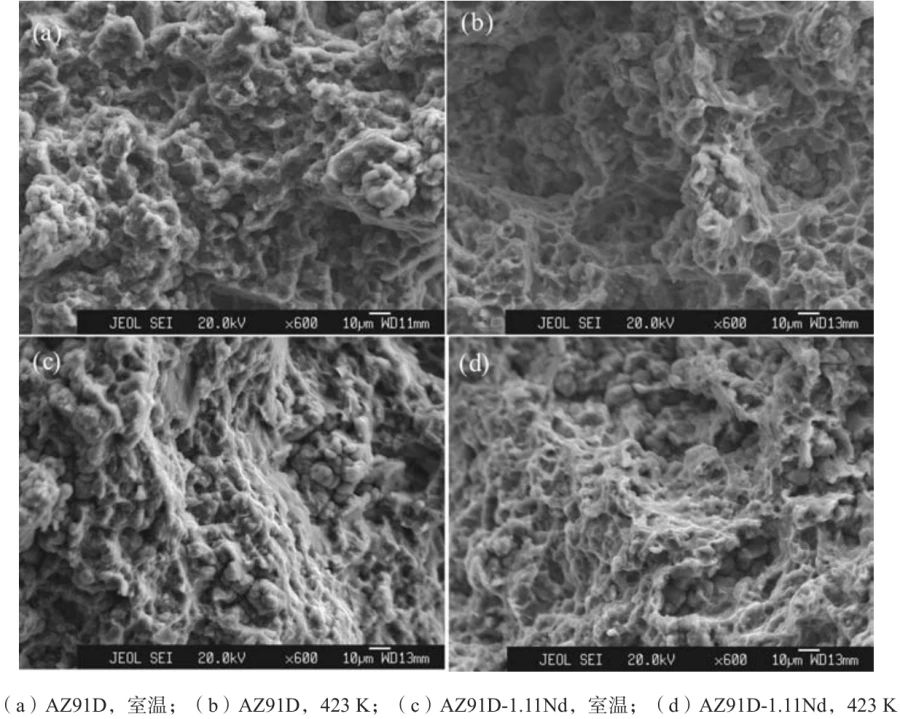 表2 壓鑄態(tài)AZ91D與AZ91D-1.11Nd合金的力學性能、導(dǎo)熱性和流動性 Su等人使用高壓壓鑄法制備了Mg-4Al-4Nd-0.2Mn合金,該合金有針狀A(yù)l11Nd3和顆粒狀A(yù)l2Nd兩種金屬間相,室溫和473 K時均表現(xiàn)出良好的強度,Al11Nd3完全分解為Al2Nd后合金室溫強度下降。這是因為Al11Nd3和Al2Nd在晶粒和晶界形成的網(wǎng)狀結(jié)構(gòu)強化晶界,其中Al11Nd3為主要強化相;Al11Nd3完全分解為Al2Nd后,晶界附近的網(wǎng)狀結(jié)構(gòu)解體,合金室溫強度下降。 本試驗所鑄AZ91D-1.11Nd合金中有Al 2 Nd和少量針狀A(yù)l11Nd3 ,Al2Nd和Al11Nd3沒有在晶界處形成網(wǎng)狀結(jié)構(gòu),而且很多Al2Nd分布在晶粒內(nèi)部,423 K時不能有效阻止晶界開裂;但是AZ91D合金中仍有大量網(wǎng)狀β-Mg17Al12存在,423 K時能夠阻止晶界開裂,所以AZ91D-1.11Nd合金423 K拉伸強度低于AZ91D合金。 圖7a、c為壓鑄態(tài)AZ91D和AZ91D-1.11Nd合金室溫拉伸斷口形貌。可見,AZ91D合金拉伸斷口分布著微孔聚集型等軸韌窩,局部可見撕裂棱和河流狀花樣,為準解理斷裂、塑韌混合斷裂,AZ91D-1.11Nd合金韌窩數(shù)量有所增加,且相對較深,與更好塑性結(jié)果相一致。圖7b、d為壓鑄AZ91D和AZ91D-1.11Nd合金高溫拉伸斷口形貌,兩個拉伸斷口分布著大量等軸韌窩,為微孔聚集型斷裂、塑性斷裂,AZ91D合金韌窩更多,更加均勻分布,表現(xiàn)出較好的塑性,與拉伸試驗結(jié)果一致。