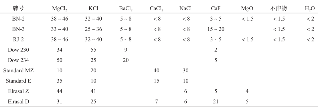 表6 耐熱鎂合金常用添加元素及其作用機(jī)制 3.3?阻燃鎂合金 鎂合金熔點(diǎn)低,熔煉時(shí)易氧化燃燒形成多孔性疏松MgO層,其密度僅為0.8,無(wú)法有效覆蓋熔體表面阻止繼續(xù)燃燒,因此鎂合金熔煉必須采用阻燃防護(hù)。鎂合金阻燃防護(hù)主要包括熔劑防護(hù)、氣體防護(hù)與合金化阻燃防護(hù),其作用機(jī)制均為覆蓋鎂合金熔體表面,阻止鎂與空氣持續(xù)接觸以阻止燃燒。表7為鎂合金常用的保護(hù)熔劑化學(xué)成分配比。鎂合金氣體防護(hù)可分為兩類:(1)選用CO?、SO?或含F(xiàn)(六氟化硫SF6 、四氟乙烷HFC-134a、氟化酮等)反應(yīng)性氣體;(2)選用Ar等惰性氣體。鎂合金阻燃防護(hù)一般常添加Ca、Be、Zn與稀土元素,反應(yīng)生成的氧化物密度一般高于1,可有效覆蓋熔體表面,起到良好的保護(hù)效果。