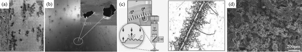 表7 鎂合金常用保護(hù)熔劑化學(xué)成分配比 wB/% 對(duì)于1%~5%Mg含量的鎂合金,添加3%的Ca元素后合金燃點(diǎn)可由500 ℃提高至750 ℃,當(dāng)Ca元素添加量達(dá)5%時(shí),其氧化膜在970 ℃大氣中暴露60 min仍致密存在。由于BeO薄膜的熱力學(xué)穩(wěn)定性好、導(dǎo)熱系數(shù)高,可及時(shí)將氧化反應(yīng)熱傳導(dǎo)至熔體外部,避免熔體溫度惡性升高,且Be元素與氧的反應(yīng)熱高于Mg元素,因此添加Be元素可獲得較佳的阻燃效果。MgZn薄膜阻止Mg氧化燃燒的效果也較為理想,但Zn元素添加含量過(guò)高時(shí)易產(chǎn)生熱裂,其添加量一般不大于1.5%。 3.4?耐蝕鎂合金 如圖4所示,鎂合金常見(jiàn)的腐蝕類型主要分為電偶腐蝕、點(diǎn)蝕、絲狀腐蝕與高溫腐蝕。絲狀腐蝕多發(fā)生于有保護(hù)性的涂層下,而未經(jīng)涂覆的純鎂、Mg-8Li、Mg-Zn-Y-Al、Mg-Al-RE-Mn等,腐蝕絲萌生后,腐蝕絲在表層沿著某個(gè)路徑向前延伸,形成一條細(xì)長(zhǎng)的腐蝕溝槽。腐蝕機(jī)制主要是由第二相或雜質(zhì)元素引起電偶腐蝕與表層MgO薄膜剝落形成的物理和化學(xué)腐蝕,隨著外電位的不斷提高與外加電流密度的持續(xù)增加,陽(yáng)極溶解反應(yīng)速度隨之加快,陰極析氫反應(yīng)也不斷增大,即鎂的NDE負(fù)差效應(yīng)。多數(shù)環(huán)境下鎂合金的表面膜主要為晶態(tài)Mg(OH)?,添加Al、Mn、Zn后,易在表層形成分層結(jié)構(gòu)表面膜層,即多孔性疏松MgO/Mg(OH)?/Al?O?/基體金屬形式的膜結(jié)構(gòu),加速了鎂合金的腐蝕。