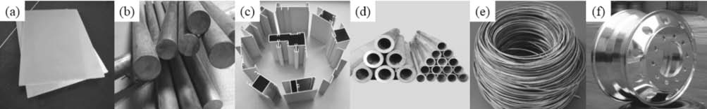 (a)電偶腐蝕;(b)點(diǎn)蝕;(c)絲狀腐蝕;(d)高溫腐蝕 目前常通過(guò)合金化與相結(jié)構(gòu)調(diào)整來(lái)改善鎂合金的耐蝕性能,對(duì)于普通鎂合金而言,F(xiàn)e、Ni、Cu、Co、Sb、Si等元素的添加量需嚴(yán)格限制,單個(gè)元素添加量應(yīng)小于0.1wt%,總添加量應(yīng)小于0.25wt%。同時(shí)可添加適量的RE元素在鎂合金表面反應(yīng)生成致密的RE?O?鈍化膜,在合金內(nèi)部形成Al 4 RE相,減少M(fèi)g17Al12相的濃度,改善鎂合金的耐蝕性。在AZ系列鎂合金中添加適量的Al可增加晶界處β相的數(shù)量、濃度,改善耐蝕性能;加入3%~5%的Ca元素可形成MgCa金屬間化合物,提高耐蝕性能;添加適量Zn可形成MgZn固溶體,第二相雜質(zhì)數(shù)量隨之減少,合金耐蝕性得以提高。不同加工工藝下的合金具有不同的相成分與含量,其腐蝕作用機(jī)制也有所差異,因此相結(jié)構(gòu)對(duì)鎂合金的耐蝕性能影響也較大。采用快速凝固、半固態(tài)鑄造結(jié)合的熱處理制度均可改變鎂合金的相組分與微觀結(jié)構(gòu),且合金基體組織更加均勻,內(nèi)部缺陷數(shù)量隨之顯著減少,合金的固溶飽和程度得以提高,可明顯改善耐蝕性能。 3.5?變形鎂合金 鎂合金室溫抗拉、屈服、塑性差,加工難度高,現(xiàn)有強(qiáng)化工藝多以犧牲塑性為代價(jià),且現(xiàn)有鑄錠制坯尺寸偏小,難以實(shí)現(xiàn)大規(guī)格的生產(chǎn)制備,與鋁合金相比,應(yīng)用面較窄。與其他加工制備工藝相比,變形鎂合金可在熱狀態(tài)下以軋制、擠壓、鍛造、拉拔等工藝方法進(jìn)行塑性成形,制成板、棒、型、管、絲與鍛件等半成品,用于后續(xù)加工裝配,見(jiàn)圖5。常用的變形鎂合金主要為Mg-Mn系、Mg-Al-Zn系與Mg-Zn-Zr系,多數(shù)是在AZ系列、ZK系列上由合金化開(kāi)發(fā)而來(lái),如AZ113、AZ151與ZM61等。