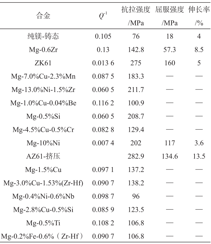 3.6?阻尼鎂合金 與橡膠、塑料阻尼板、泡沫塑料、阻尼復(fù)合材料、阻尼涂料等有機(jī)材料相比,鎂合金密度低、比剛度高、抗電磁屏蔽與輻射能力強(qiáng),且具有極佳的減振性能,目前已在航天衛(wèi)星、運(yùn)載火箭、槍械、智能機(jī)器人、無(wú)人機(jī)等領(lǐng)域得到了廣泛應(yīng)用,引起了學(xué)術(shù)界的廣泛關(guān)注 。金屬材料的阻尼機(jī)制主要分為位錯(cuò)型阻尼、復(fù)相型阻尼、鐵磁型阻尼以及欒晶型或晶界型阻尼,低溫下鎂合金阻尼機(jī)制為位錯(cuò)阻尼,滿足Granato和Lucke提出的位錯(cuò)釘扎-脫釘模型,即G-L理論;高溫環(huán)境下除了位錯(cuò)阻尼作用機(jī)制外,還含有晶界阻尼。鎂合金阻尼性能的改善可通過(guò)以下三種工藝方法實(shí)現(xiàn):晶粒細(xì)化與位錯(cuò)強(qiáng)化、鎂基復(fù)合材料和熱處理調(diào)控。表8為幾種常見(jiàn)鎂合金的阻尼性能與力學(xué)性能。