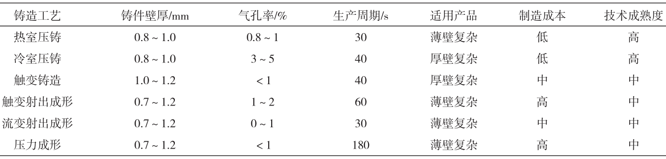 表9 常用壓鑄鎂合金的力學(xué)性能 4、鎂合金加工技術(shù)研究現(xiàn)狀及發(fā)展趨勢(shì) 鎂合金鑄件占所有鎂合金加工成形工藝制件總量的40%,壓鑄占比鎂合金鑄造制件總量的65%以上。鎂合金壓鑄分為冷室壓鑄與熱室壓鑄,冷室壓鑄又分為立式壓鑄與臥式壓鑄,除壓鑄外還包括砂型鑄造、擠壓鑄造、半固態(tài)觸變成形鑄造與觸變成形鑄造。航空航天用鎂合金制件由于批量小、品種多,一般多選用砂型鑄造。擠壓鑄造常選用較低的充型速度與最小的撓度,充型速度一般不大于2m/s,充型壓力不低于70MPa。擠壓鑄件按熱處理強(qiáng)化工藝又可分為直接擠壓鑄造與間接擠壓鑄造。半固態(tài)觸變成形鑄造是將合金熔體加熱到含有球狀固相組分的半固態(tài)漿料,擠壓至模具進(jìn)行成形制造。觸變鑄造是將制備的球狀晶體(觸變材料)鑄錠或棒料再次加熱到固液糊狀區(qū),借助壓鑄或鍛壓設(shè)備加壓成形,成形的制件具有致密度高、力學(xué)性能高的特點(diǎn)。鎂合金壓鑄與擠壓成形工藝的典型力學(xué)性能見(jiàn)表10。表11所示為鎂合金不同成形制造工藝的對(duì)比結(jié)果。