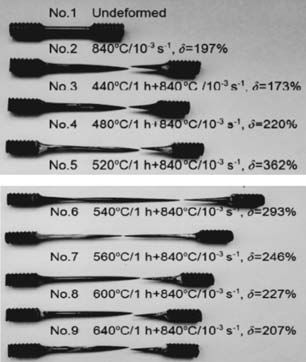 表11 鎂合金鑄造成形制造方法對(duì)比 與常規(guī)的鑄造成形工藝相比,可采用鍛造、擠壓或軋制等塑性成形工藝細(xì)化材料內(nèi)部微觀組織,消除材料內(nèi)部的氣孔、疏松等鑄造缺陷,提高材料力學(xué)性能。常用的高強(qiáng)鎂合金多為變形鎂合金,如M1、M2、AZ31、AZ61、AZ63、AZ80、ZK60等牌號(hào);軋制成形鎂合金多選用Mg-Mn系合金(如MB1、MB8)或Mg-Al-Zn系(AZ31B)與Mg-Li系(LA141),用于制造中厚板與薄板產(chǎn)品。鎂合金室溫?cái)D壓工藝性較差,擠壓溫度一般高于150 ℃,在175 ℃擠壓溫度下擠壓比可達(dá)2.0,在225 ℃下可達(dá)3.0,常用的擠壓鎂合金多為AZ31B、ZM21、ZK60A與HK31等。鎂合金室溫鍛造極易開(kāi)裂,鍛造溫度一般控制在200~400 ℃,當(dāng)鍛造溫度超出400 ℃時(shí),易產(chǎn)生腐蝕氧化、晶粒粗大等,鍛造工藝性能較差。 與多數(shù)金屬材料不同,鎂合金通過(guò)選擇合適的組織結(jié)構(gòu)與形變溫度可獲得良好的超塑性,可在應(yīng)變速率大于0.01 s下獲得高達(dá)100%以上的伸長(zhǎng)率,實(shí)現(xiàn)薄壁精密結(jié)構(gòu)的精確成形。MB26鎂合金在1.67×10﹣³ ~4.1×10-² s-¹ 應(yīng)變速率與250~480 ℃溫度下具有良好的超塑性;當(dāng)溫度升至350~450 ℃時(shí)伸長(zhǎng)率可高達(dá)520%,在1.17×10-³ s-¹應(yīng)變速率與400 ℃下伸長(zhǎng)率可達(dá)1450%。圖6為鎂合金超塑性成形斷后伸長(zhǎng)率的實(shí)物示意圖。