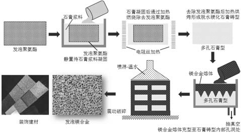 表12 噴射沉積制備鎂基工程合金的力學(xué)性能 除上述加工工藝外,鎂合金較為成熟的加工成形技術(shù)還包括大塑性成形技術(shù)、等徑角擠壓技術(shù)、高壓扭轉(zhuǎn)技術(shù)、攪拌摩擦加工技術(shù)與累積軋制技術(shù)。大塑性成形技術(shù)SPD可直接將材料內(nèi)部組織細(xì)化至亞微米乃至納米級(jí),晶粒細(xì)化效果顯著,可分為等通道轉(zhuǎn)角擠壓與累積疊軋。等徑角擠壓ECAP具有兩個(gè)截面相同的通道模具,材料在擠壓作用下經(jīng)過(guò)兩個(gè)通道的轉(zhuǎn)角處(多為90°、120°)產(chǎn)生大剪切塑性變形,經(jīng)多次重復(fù)擠壓可獲得較高的應(yīng)變量。高壓扭轉(zhuǎn)HPT可細(xì)化材料組織并改善材料性能。由于扭轉(zhuǎn)時(shí)距中心距離有所差異,材料內(nèi)部各區(qū)域的晶粒細(xì)化程度略有差異。攪拌摩擦加工FSP在攪拌頭劇烈作用下可產(chǎn)生劇烈的塑性變形,實(shí)現(xiàn)材料晶粒細(xì)化、微觀組織均勻化與致密化。累積軋制對(duì)板材進(jìn)行裁剪、堆垛、軋制、再裁剪,并多次重復(fù)循環(huán),以獲得所需的累積應(yīng)變量,具有與ECAE相當(dāng)?shù)木Я<?xì)化能力,軋制次數(shù)越多,材料內(nèi)部組織越均勻。 在鎂合金的加工過(guò)程中,不可避免地將產(chǎn)生一些加工碎屑與邊角料。為了實(shí)現(xiàn)變廢為寶,可將石膏漿料滲透到發(fā)泡聚氨酯棉內(nèi)部,再通過(guò)加熱燃燒去除掉發(fā)泡聚氨酯,得到多孔性石膏模具。在石膏模具烘烤焙燒后,對(duì)其抽真空利用壓力將鎂合金熔體滲透到多孔性石膏模具內(nèi),采用噴淋與震動(dòng)破碎清除石膏后即可獲得具有連通孔洞的發(fā)泡鎂合金材料,此工藝制備的發(fā)泡鎂合金材料可廣泛應(yīng)用于建材、裝飾等行業(yè),整個(gè)工藝制備過(guò)程見(jiàn)圖8。