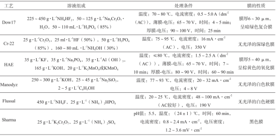 表14 鎂合金陽(yáng)極氧化工藝參數(shù) 鎂合金可采用電鍍工藝在表層形成致密鍍層,工藝流程為清洗→侵蝕→活化→浸鋅→氰化鍍銅→電鍍,多選用Cu與Cu-Ni-Cr鍍層。化學(xué)鍍是利用金屬鹽與還原劑在鍍液中發(fā)生氧化還原反應(yīng),主要以Ni-P鍍層為主,鎂合金在電/化學(xué)鍍時(shí)在表面極易形成氧化膜,阻礙沉積金屬與鎂合金形成金屬-金屬鍵,可先采用化學(xué)轉(zhuǎn)化在表層鍍鎳,再進(jìn)行電/化學(xué)鍍,一般多采用清洗→除油→堿洗→酸蝕→堿活化→堿性化學(xué)預(yù)鍍鎳→酸性化學(xué)鍍鎳的工藝流程。鎂合金的物理氣相沉積(PVD)表面防護(hù)工藝主要包括真空蒸鍍、濺射鍍膜和離子鍍膜、電子束物理氣相沉積EB-PVD,在鎂合金表面采用PVD技術(shù)制備Cr與CrN多層膜層,可顯著改善合金的耐磨性能,PVD制備工藝成本昂貴,且制備溫度一般多為450~550 ℃,遠(yuǎn)高于鎂合金的穩(wěn)定化溫度,故實(shí)際工業(yè)生產(chǎn)中采用較少。 熱噴涂通過(guò)火焰、電弧或等離子體熱源可將線狀或粉狀原料加熱至半熔化/熔化態(tài),以高速熔滴噴在金屬基體表面,強(qiáng)化材料的耐磨與耐蝕性能,鎂合金多選用Al元素形成致密的β-Mg17Al12涂層,熱噴涂由于成形時(shí)間短、噴射速度極高、涂層表面的孔隙率較高,后期還需經(jīng)激光熔覆、密封處理、熱壓、陽(yáng)極電鍍等處理以提高涂層的致密度。Sulzer Metco公司開(kāi)發(fā)出了Protal激光輔助熱噴涂工藝,可將鎂合金的表面清理與熱噴涂結(jié)合在一起,已在氣輪機(jī)葉片、電機(jī)零件等制件廣泛應(yīng)用。當(dāng)鎂合金需要短時(shí)腐蝕防護(hù)時(shí),可采用環(huán)氧樹(shù)脂、聚氨酯、橡膠、油脂、油漆、瀝青等有機(jī)材料,起屏蔽、鈍化緩蝕與電化學(xué)保護(hù),但其耐磨性較差,且在高溫環(huán)境下易剝落。對(duì)于形狀結(jié)構(gòu)簡(jiǎn)單的鎂合金制件,還可采用離子注入表面防護(hù)工藝,離子注入在10~100 kV靜電場(chǎng)和高真空環(huán)境下,經(jīng)加速的高能離子高速?zèng)_擊注入金屬材料內(nèi)部,注入深度與離子能量、種類和基體狀態(tài)息息相關(guān),離子在金屬材料內(nèi)部的置換或間隙位置分布,可形成大量的亞穩(wěn)相與沉淀強(qiáng)化相,提高鎂合金的耐蝕性能。近年來(lái),在離子注入的基礎(chǔ)上又發(fā)展出了加弧輝光等離子表面防護(hù)工藝,通過(guò)引弧電極引燃電弧,可在金屬材料表面形成高溫、高壓、高電流密度、高速等離子體陰極弧斑,改善鎂合金的表層強(qiáng)度。鎂合金的激光防護(hù)主要包括激光表面重熔、激光表面合金化、激光熔覆、激光多層熔覆等工藝,激光防護(hù)可在金屬材料表面實(shí)現(xiàn)快速熔化、凝固,而保持金屬基體材料性能不變。Mg-Li、Mg-Zr系合金已廣泛采用激光表面重熔工藝進(jìn)行表面防護(hù),對(duì)AZ91和WE54合金采用激光熔覆在表面生成AlSi30涂層后,體積磨損量分別減少了38%與57%。考慮到離子注入、激光處理后的鎂合金制件存在表面殘余應(yīng)力大、防護(hù)作用面積有限等缺陷,近年來(lái)發(fā)展了HIPIB技術(shù),可在鎂合金表面獲得晶粒細(xì)化、成分均勻的表面防護(hù)涂層。對(duì)于鎂合金表面滲層處理而言,目前主要還是采用離子滲氮技術(shù),可顯著提高其耐蝕、耐磨性能。 盡管當(dāng)前鎂合金可選用多種表面防護(hù)工藝,但綜合制備成本、操作簡(jiǎn)便性與防護(hù)效果來(lái)看,微弧氧化仍是目前應(yīng)用最為廣泛的防護(hù)工藝,根據(jù)控制方式可分為恒定電壓微弧氧化與恒定電流微弧氧化,一般多選用恒定電流制備工藝。微弧氧化制備流程為首先在金屬材料表面形成氧化膜,隨后氧化膜被擊穿發(fā)生等離子微弧放電,氧化膜在放電作用下進(jìn)一步向材料內(nèi)部滲透,最終達(dá)到氧化膜層的氧化、熔融與凝固平穩(wěn)狀態(tài),其制備工序一般為:去油處理→微弧氧化處理→清洗→熱水封閉→吹干或晾干。在鎂合金微弧氧化領(lǐng)域,國(guó)內(nèi)的北京航空材料研究院、北京師范大學(xué)、哈爾濱環(huán)亞微弧技術(shù)公司、兵工52所寧波分所、北京有色金屬研究院與西安理工大學(xué)等開(kāi)展的研究工作較為顯著,所研制的微弧氧化制備工藝已廣泛應(yīng)用于鎂合金汽車(chē)發(fā)動(dòng)機(jī)罩蓋、箱體、踏板、輪轂、方向盤(pán)、座椅與3C殼體等部件。未來(lái)鎂合金表面防護(hù)工藝的發(fā)展將重點(diǎn)開(kāi)展綜合性防護(hù)工藝的研究,對(duì)于陽(yáng)極氧化、微弧氧化、噴涂等多孔型防護(hù)涂層而言,將著重加強(qiáng)對(duì)其密封材料與后處理工藝的研究,同時(shí)也將加大對(duì)稀土元素改善電解液的作用機(jī)制與工藝效果研究,注重開(kāi)展新型環(huán)保型表面防護(hù)工藝在鎂合金材料領(lǐng)域的應(yīng)用嘗試。 6、鎂合金未來(lái)發(fā)展方向