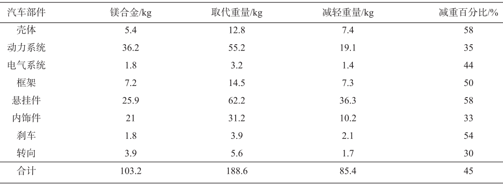表2 汽車(chē)領(lǐng)域用鎂合金減重效果(對(duì)比鋁合金)