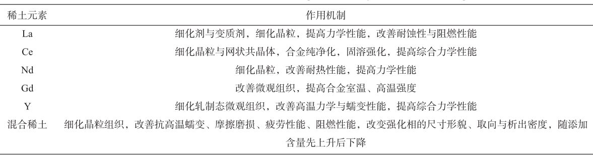 圖3 鎂合金材料的典型應(yīng)用 3、鎂合金材料研究現(xiàn)狀及發(fā)展趨勢(shì) 3.1?稀土鎂合金 通過(guò)添加稀土元素可提高鎂合金的力學(xué)性能與高溫物化性能,稀土元素的作用機(jī)制主要包括晶粒細(xì)化、晶界強(qiáng)化和固溶強(qiáng)化。表5所示為鎂合金常用稀土添加元素及其作用機(jī)制。添加Ca、Sr元素可明顯改善二次相的熱穩(wěn)定性,添加Si、Zr元素可顯著改善壓鑄鎂合金的高溫蠕變性能。馬健研究指出:當(dāng)Mg-5Sn-1Si合金Y添加含量由0.2%增至0.8%時(shí),生長(zhǎng)抑制因子GRF由16.94提高至17.96,枝晶臂間距由23.7 μm降低至12.5 μm,減少約47%。朱利敏通過(guò)添加Sm元素,顯著改善了Mg-8Gd-0.5Zr與Mg-8Gd-3Sm-0.5Zr合金在350~500 ℃變形溫度、0.002~0.1 s-¹應(yīng)變速率下的變形激活能,細(xì)化了再結(jié)晶的晶粒尺寸。