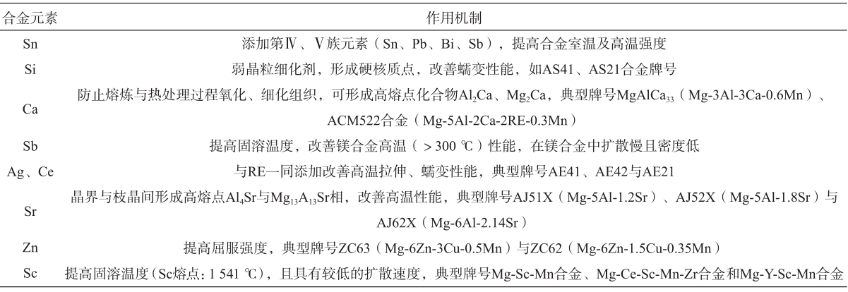 表5 鎂合金常用的稀土添加元素及其作用機(jī)制 3.2?耐熱鎂合金 耐熱鎂合金主要分為Mg-Al系耐熱鎂合金(AZ、AS和AM系列)、Mg-Zn系耐熱鎂合金(ZE、ZC和ZAC系列)、Mg-Zn-Al系耐熱鎂合金與Mg-RE系耐熱鎂合金(WE、ZE和QE系列) 。國(guó)內(nèi)應(yīng)用最廣泛的ZM5耐熱鎂合金使用溫限為120 ℃,ZM6使用溫限可達(dá)200~250 ℃,當(dāng)需要長(zhǎng)期服役溫度超出260 ℃時(shí),國(guó)內(nèi)尚無(wú)成熟的合金牌號(hào)可供選擇。美歐的WE43、WE54、QE22、Electron21與俄羅斯的MⅡ9、MⅡ10、MⅡ14長(zhǎng)期使用溫限可達(dá)228 ℃。表6所示為耐熱鎂合金的常用添加元素及其作用機(jī)制。耐熱鎂合金的強(qiáng)化機(jī)制為晶內(nèi)與晶界雙重強(qiáng)化,通過(guò)減小原子擴(kuò)散速率、限制位錯(cuò)運(yùn)動(dòng)、阻止晶界滑移,結(jié)合固溶強(qiáng)化、析出強(qiáng)化、準(zhǔn)晶強(qiáng)化與復(fù)合強(qiáng)化,可有效提高耐熱使用溫限;基于此,一般常選用大尺寸晶粒以增大原子擴(kuò)散距離,減少晶界擴(kuò)散通道;添加稀土元素在晶界析出細(xì)小的熱穩(wěn)定強(qiáng)化相,釘扎晶界阻止晶界滑移;采用固溶強(qiáng)化可在晶內(nèi)析出大量細(xì)小彌散分布的熱穩(wěn)定相阻礙位錯(cuò)滑移。耐熱鎂合金未來(lái)發(fā)展主要集中在以下四個(gè)方面:(1)研究低成本稀土元素Ca、Sr、Ba與Ⅳ、Ⅴ族元素對(duì)鎂合金耐熱性能的影響規(guī)律與作用機(jī)制,開(kāi)發(fā)低成本合金;(2)采用快凝技術(shù)制備微米級(jí)乃至納米級(jí)準(zhǔn)晶組織,提高合金耐熱溫限;(3)采用單向擠壓、等通道轉(zhuǎn)角擠壓、扭轉(zhuǎn)擠壓、往復(fù)擠壓等大塑性成形工藝,實(shí)現(xiàn)晶粒與析出相的強(qiáng)化,提高耐熱性能;(4)通過(guò)新的熱處理技術(shù)與工藝裝備,提高合金的使用溫限。