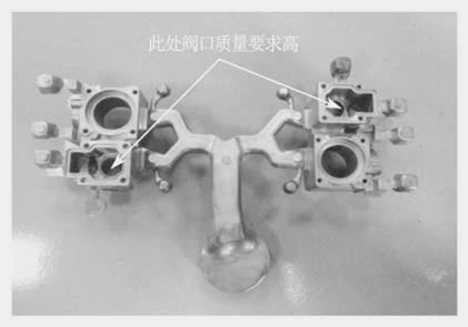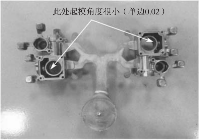 圖7 慢速填充理論計算與實際狀態 吹氣是去除水分殘留的有效方法,但噴霧機吹氣次數過多,吹氣時間過長也并非好事,過度依賴吹氣不僅損失了模溫,也浪費了資源。模溫越低水分殘留越多,越得靠吹氣解決,如此循環。所以脫模劑配比濃度應盡可能偏高,在增強潤滑模具的同時減少水分的噴出量。 2.1.6 環因素 環指環境因素,它對以上各環節都可造成影響,主要是安全方面,這也是個不可忽略的因素。環境溫度的變化會影響人員的情緒,存在安全方面的隱患,還會影響設備精度和性能,夏天設備故障率總是偏高些。對于精密切削加工工序和檢測工序,環境溫度對于尺寸精度的影響是很大的,有些小細節往往不被關注。 壓鑄生產現場容易忽視的問題:對于沒有模溫機配合的生產現場,一定要根據夏冬兩季的環境溫度變化,即時調整脫模劑濃度和噴霧時間以及冷卻水流量,使模具溫度保持在合適的相對穩定的溫差范圍。如:夏天環境溫度高脫模劑可用較低的配比濃度,適當長的噴霧時間。冬天環境溫度低脫模劑可用較高的配比濃度,適當縮短噴霧時間。根據夏冬兩季的環境溫度變化,夏天加大冷卻水流量,冬天減小冷卻水流量。定期清理冷卻水道,保持冷卻效果。 對于空氣相對濕度較高的地區,當空氣相對濕度達到90%或更高時,除了壓鑄件容易發黑發霉外,空氣壓縮機產生的氣體中也會含有大量乳化水,使壓鑄件產生氣孔等。 高濕度季節易引發電器故障,對于暫停生產的設備應定期保持通電狀態,特別是弱電控制系統通電可讓其靠自熱保持干燥。 2.1.7 測因素 測就是品質檢驗,主要指測量工具、測量方法,以及經過培訓和授權的測量人。在現代生產過程中,測是重要的因素,沒有檢測控制是很難保證產品質量的。在測量控制時需要注意:①是否指定了責任人;②是否采用規定的測量工具;③是否在指定的測量點;④是否運用正確的測量方法;⑤是否按照一定的頻次進行了測量;⑥是否有記錄。提高測量器具的易操作性并能保證測量的精度,這對產品質量控制很有幫助。 3、壓鑄工藝維穩策略應用實例 3.1?脫模劑維穩 單獨配比脫模劑應用實例如圖8、圖9所示的閥體,由于個別孔位起模斜度很小,所以只能使用5027脫模劑,而且配比濃度偏高(1∶160~180),這樣產品質量較好,可以達到現場生產的穩定。