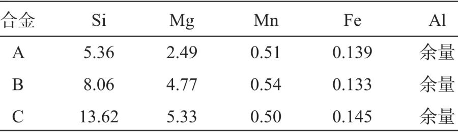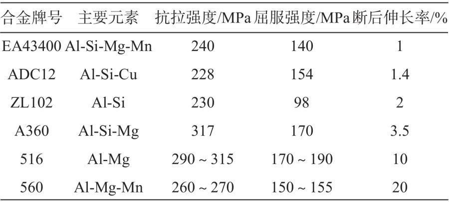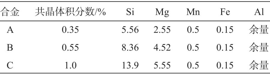 表1 工業(yè)常用壓鑄鋁合金鑄態(tài)性能 由于超細(xì)共晶組織能提高合金的強(qiáng)度和塑性,因此,近年來(lái)具有二元或者多元超細(xì)共晶或者亞共晶組織的研究得到廣泛的關(guān)注。目前超細(xì)共晶合金系列相對(duì)較少,例如TiNbCoCuAl合金,由于組織中存在超細(xì)共晶組織,其特定取向的共晶相阻礙位錯(cuò)運(yùn)動(dòng),提高合金強(qiáng)度及塑性。但對(duì)于壓鑄Al-Si合金,鑄態(tài)下屈服強(qiáng)度超過(guò)200 MPa仍然是一個(gè)挑戰(zhàn)。 1、試驗(yàn)材料與方法 試驗(yàn)所用原料有工業(yè)純Al(99.7%)、金屬Si(99.7%)、純Mg(99.9%)及Al-20Mn中間合金。首先將工業(yè)純Al表面油污及其他雜質(zhì)清洗去除烘干后,加入壓鑄機(jī)機(jī)邊爐(容量300 kg)中200 kg,壓鑄機(jī)型號(hào)為海天DC-300(普通冷式壓鑄機(jī))。按照表2進(jìn)行成分調(diào)配,熔煉溫度控制在(730±10)℃,待全部熔化后,靜置30 min,進(jìn)行除氣精煉,石墨轉(zhuǎn)子轉(zhuǎn)速380 r/min,除氣時(shí)間15 min。采用SPECTROLAB M12直讀光譜儀測(cè)定合金成分,實(shí)際成分如表3。\