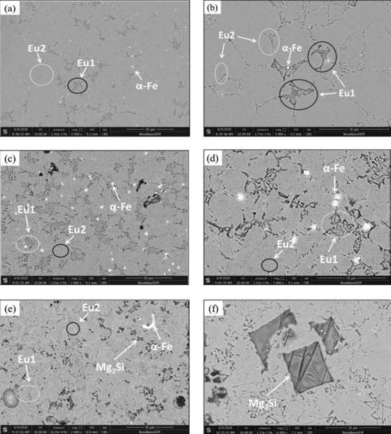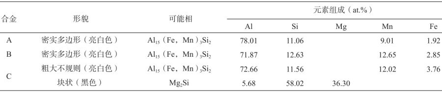 (a)、(b)合金A;(c)、(d)合金B(yǎng);(e)、(f)合金C 圖6 合金組織SEM-BSE圖 合金C中,如圖6e,并沒(méi)有發(fā)現(xiàn)許多彌散分布的細(xì)小α-AlFeMnSi相,僅有非常少的α-AlFeMnSi相,且呈粗大不規(guī)則狀,其長(zhǎng)度約20 μm;同時(shí)在合金C組織中出現(xiàn)了大量的粗大的四方體Mg2 Si相,合金中不同中間相的平均化學(xué)成分如表5。圖6b、d中有兩種共晶組織,標(biāo)注為Eu1和Eu2,合金A、B中這兩種共晶組織的形貌和大致尺寸基本相似,但合金B(yǎng)中的Eu1稍寬些。Eu1中含分枝狀的Mg2 Si,在合金A中其分枝間距約0.4~1.2 μm,而合金B(yǎng)中的Eu1分枝間距約0.7~3 μm。合金A和B的Eu2共晶體中包含了α-Al、Si、Mg2 Si以及針狀π-AlMnFeSiMg相。合金C中的Eu2和合金A、B中的形貌類(lèi)似,但尺寸更加細(xì)小,如圖6e;與合金A、B不同的是,合金C中含有大量的密實(shí)塊狀Mg2 Si相,尺寸約15 μm左右,如圖6f。