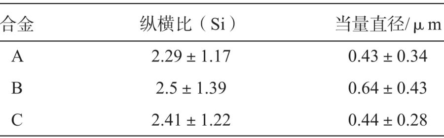 表5 合金中中間相的化學(xué)組成(SEM-EDS) 在Eu2共晶組織中有大量的共晶Si相,其形貌仍呈針狀,縱橫比及當(dāng)量直徑如表6,可知其縱橫比相近。對(duì)比當(dāng)量直徑,合金A中Si的當(dāng)量直徑最小為(0.43±0.34)μm,而合金B(yǎng)中Si的當(dāng)量直徑最大為(0.64±0.43)μm。在相同的冷卻條件下,本試驗(yàn)合金中的共晶Si尺寸要比二元Al-Si合金中的共晶Si要細(xì)小得多。