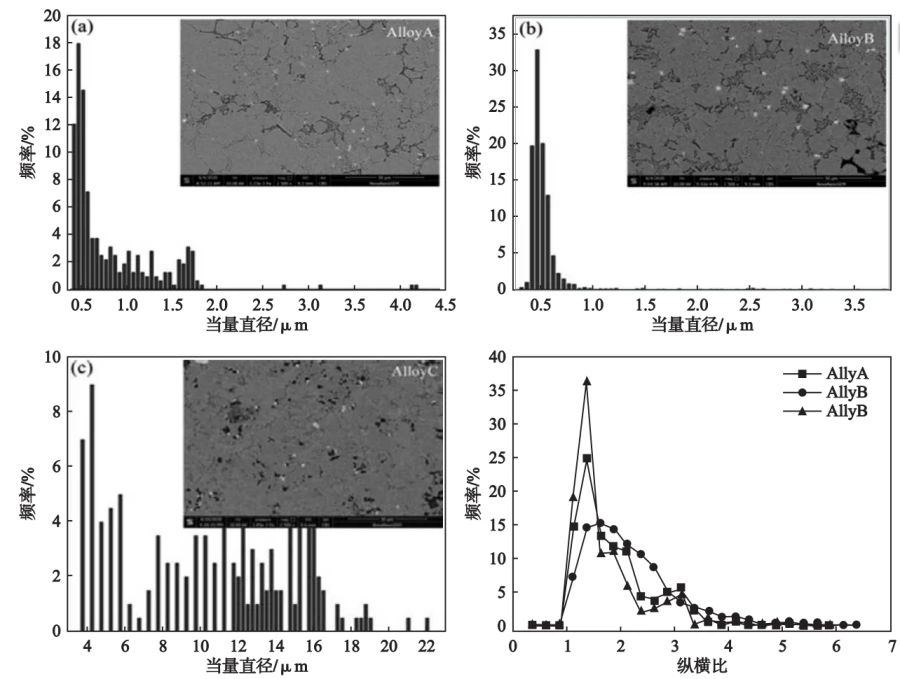 表6 合金A、B、C中Si顆粒的縱橫比及當(dāng)量直徑 2.6?合金 A、B、C 中 α-AlFeMnSi 相尺寸分布 圖7是三種合金中α-AlFeMnSi顆粒的尺寸分布。合金A和B中的α-AlFeMnSi顆粒尺寸相對(duì)集中且非常細(xì)小,在0.5~1.5 μm之間;而合金C中α-AlFeMnSi顆粒尺寸較大且分布彌散,尺寸在4~18 μm之間。另外圖7d統(tǒng)計(jì)了α-AlFeMnSi顆粒的縱橫比,從統(tǒng)計(jì)結(jié)果可知合金B(yǎng)和C中的α-AlFeMnSi顆粒的縱橫比小于合金A。