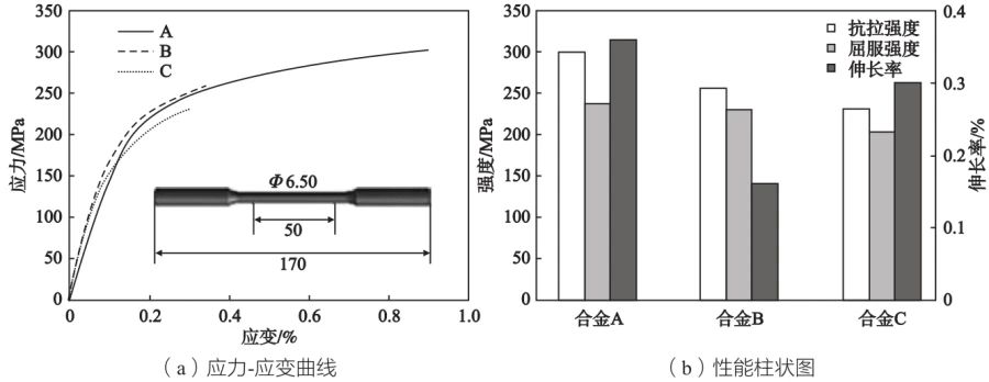 圖7 合金中的α-AlFeMnSi相尺寸分布及α-AlFeMnSi相縱橫比-頻率分布曲線 2.7?拉伸性能分析 圖8a為壓鑄Al-Si-Mg-Mn合金的拉伸應(yīng)力-應(yīng)變曲線。三種合金的鑄態(tài)屈服強(qiáng)度均超過(guò)了200 MPa,但三種合金幾乎沒(méi)有塑性。圖8b是三種不同共晶體積分?jǐn)?shù)的Al-Si-Mg合金的拉伸性能對(duì)比圖,合金A屈服強(qiáng)度達(dá)236 MPa,伸長(zhǎng)率僅0.36%;合金B(yǎng)屈服強(qiáng)度229 MPa,伸長(zhǎng)率約0.16%;合金C的屈服強(qiáng)度僅202 MPa,伸長(zhǎng)率0.3%。相比表1中常見(jiàn)牌號(hào)的壓鑄鋁合金,此三種合金的屈服強(qiáng)度更高,且該合金中沒(méi)有其他合金元素,如Cu、Zn等強(qiáng)化元素。
