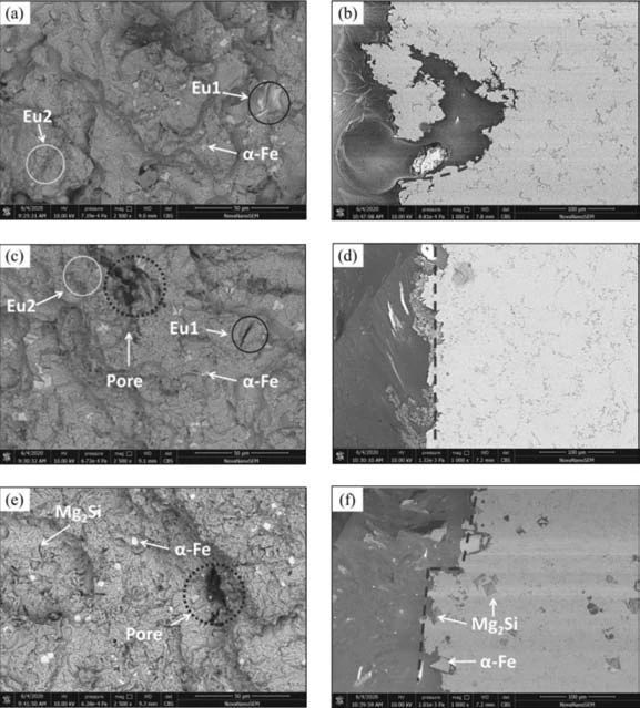 圖8 鑄造Al-Si-Mg-Mn合金拉伸性能 2.8?斷口形貌分析 圖9a、c、e分別是合金A、B、C的斷口中部形貌,圖中均可觀察到大量的亮白色α-AlFeMnSi相,從圖中還可以觀察到斷裂從初生相和共晶處開(kāi)始。在合金B(yǎng)和C斷口中還有孔洞的存在,如圖9c、e。合金A和B在共晶區(qū)域發(fā)生了斷裂,如圖9b、d,而合金C除了在共晶區(qū)域斷裂,同時(shí)也在粗大的Mg2 Si顆粒上斷裂,如圖9f。同時(shí)值得指出的是,合金A的斷裂呈撕裂狀;而合金B(yǎng)和C則非常平滑,呈直線狀。