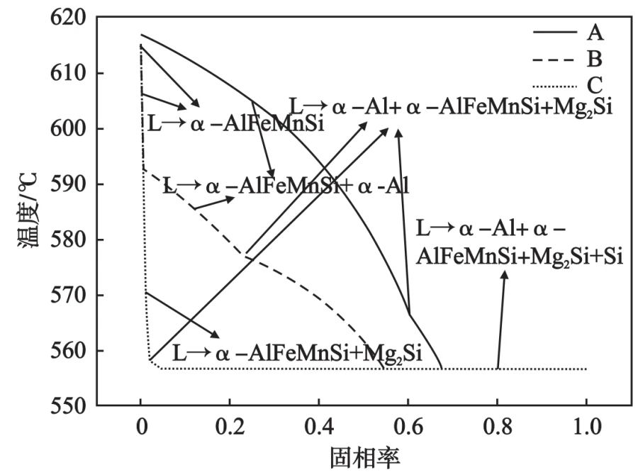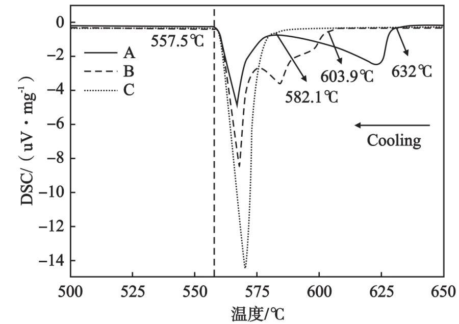 (a)、(b)合金A;(c)、(d)合金B(yǎng);(e)、(f)合金C 圖4 Al-Si-Mg-Mn合金組織演變 2.4?DSC 分析 圖5是合金A、B、C的DSC分析曲線。從圖中凝固曲線可分析得出最終凝固溫度在557.5 ℃,這與圖2中模擬計(jì)算的最近四元共晶反應(yīng)的溫度相接近。合金A有兩個(gè)明顯吸熱峰,對(duì)應(yīng)的是α-Al枝晶、三元共晶和四元共晶的形成,其中三元共晶反應(yīng)和四元共晶反應(yīng)非常接近。合金B(yǎng)則出現(xiàn)了三處吸熱峰,分別對(duì)應(yīng)α-AlFeMnSi、二元共晶和三元共晶以及四元共晶反應(yīng)。對(duì)于合金C,從DSC曲線只發(fā)現(xiàn)了一個(gè)峰值,這主要是共晶反應(yīng)(包括二元、三元和四元反應(yīng))以及微量的α-AlFeMnSi,這和模擬分析相一致。這是由于DSC分析中冷卻速率非常慢,幾乎接近平衡凝固,因此一些中間化合物或者三元共晶反應(yīng)會(huì)在最終共晶反應(yīng)時(shí)析出。合金A具有最高的凝固溫度(632 ℃),而合金C則最低,僅582.1 ℃。
