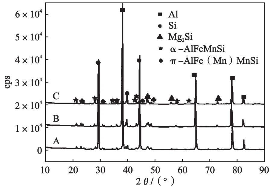 圖2 Al-Si-Mg-Mn合金凝固路徑模擬 隨著Mg和Si含量的改變,共晶體積分?jǐn)?shù)由0.4到1.0。三種合金在凝固最終(約556.9 ℃)發(fā)生四元共晶反應(yīng):L→α-Al+α-AlFeMnSi+Mg 2 Si+Si。在發(fā)生三元L→α-Al+α-AlFeMnSi+Mg2 Si時(shí),合金A由L→α-Al和L→α-Al+α-AlFeMnSi形成0.58的固相;合金B(yǎng)由L→α-AlFeMnSi和L→α-Al+α-AlFeMnSi反應(yīng)形成0.22的固相;合金C中由L→α-AlFeMnSi和L→α-AlFeMnSi+Mg2 Si反應(yīng)形成0.02的固相。三元反應(yīng)結(jié)束時(shí),三種合金的固相率分別為0.67、0.54、0.04。 2.2?XRD 分析 圖3是不同共晶體積分?jǐn)?shù)的Al-Si-Mg-Mn合金XRD圖譜,分析得出主要的衍射峰相標(biāo)定為α-Al、Si、Mg2 Si和α-AlFeMnSi相。值得指出的是,有些微小的峰為π-AlFe(Mn)MgSi相。