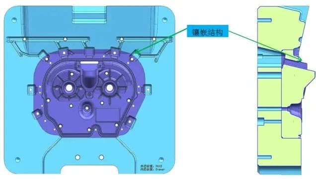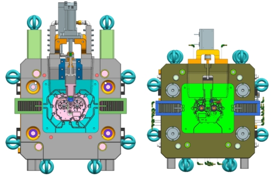 圖4 模具鑲嵌方式 經(jīng)過對(duì)壓鑄件的分析, 要避開密封槽的位置進(jìn)澆, 壓鑄件上唯一可以選取的位置只有壓鑄件中間的兩個(gè)孔位, 而且壓鑄件的基本形狀呈圓形餅狀結(jié)構(gòu), 兩孔位在中間位置, 筋條呈輻射傘狀, 所以采用中心進(jìn)澆對(duì)壓鑄件的排氣等都有非常好的效果, 因此決定采用雙中心進(jìn)澆三模板的設(shè)計(jì), 見圖5。