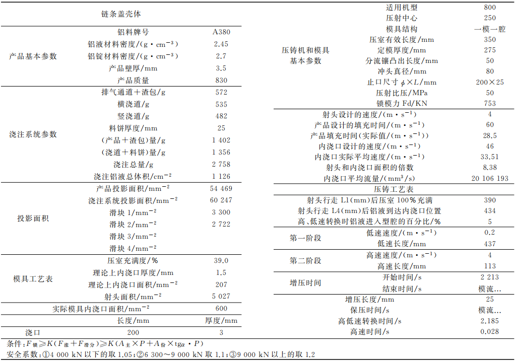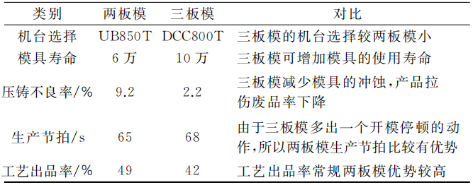 表2 兩模板和三模板生產(chǎn)效果對(duì)比 切刀材料材質(zhì)為H13, 硬度為HRC44~46, 刀口成45°角, 可避免粘鋁現(xiàn)象。彈性鎖模裝置鎖緊力為40kN, 避免動(dòng)模板與定模移動(dòng)板提前分離。模具的導(dǎo)柱與模板制作精度要高, 定模固定板、定模移動(dòng)板、動(dòng)模板需要同時(shí)配模, 合模油要分布均勻.模具安裝到壓鑄機(jī)上, 用手推動(dòng)定模移動(dòng)板, 需無明顯卡頓現(xiàn)象。