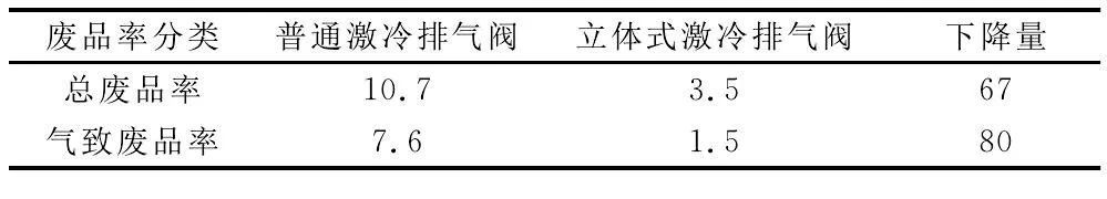 表2 產品廢品率統計(%) 立體式激冷排氣閥能將模具型腔中的氣體高效抽出,達到消除或降低氣致工藝缺陷,提高鑄件內在品質的目的,同時改進了產品外觀品質。立體式激冷排氣閥壓鑄在繼承普通排氣塊真空壓鑄工藝優勢的同時大大改善了鑄件的品質,提高了工藝出品率和合格率,適合于復雜壓鑄件的生產。