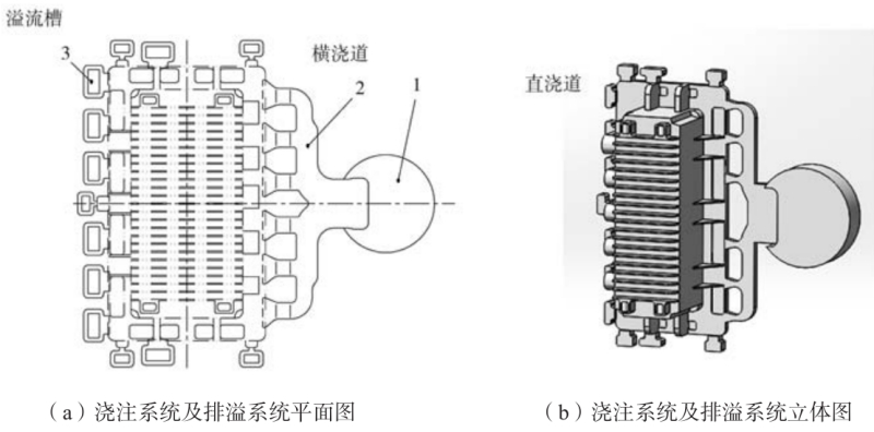 圖2 分型面設(shè)置 2.2 澆注系統(tǒng)及排溢系統(tǒng)設(shè)計(jì) 根據(jù)壓鑄模具澆注系統(tǒng)的設(shè)計(jì)原則,金屬料流方向應(yīng)該平行于散熱片的方向,以避免產(chǎn)生冷隔、夾渣、氣泡、疏松、散熱片不成形等缺陷。另外,內(nèi)澆口的位置應(yīng)設(shè)置在厚壁處,讓金屬液首先充填厚壁部分,以免厚壁處產(chǎn)生夾渣、疏松等鑄造缺陷。因此,為了使金屬液能夠快速充滿型腔,在殼體凸臺(tái)一側(cè)設(shè)置6個(gè)內(nèi)澆口。橫澆道采用階梯圓弧過渡式設(shè)計(jì),能夠保證足夠的充填速度。直澆道設(shè)置分流錐,分流錐設(shè)計(jì)成圓弧過渡的結(jié)構(gòu)形式,可以在壓鑄時(shí)加快金屬液的充填速度。溢流槽應(yīng)設(shè)置在料流方向的末端。如圖3所示,在鑄件成形型腔的三面設(shè)置了13個(gè)溢流槽及排氣道。