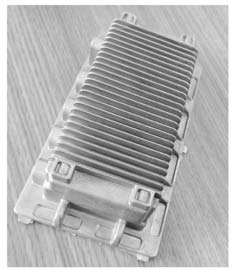圖4 模具總裝圖 2.5 模具結(jié)構(gòu)與總裝設(shè)計(jì) 圖4所示為本模具的總裝結(jié)構(gòu)圖。本模具采用普通的兩板式結(jié)構(gòu),考慮到鑄件結(jié)構(gòu)的復(fù)雜性以及模具制作的成本因素,模具的型腔和型芯部分采用活動(dòng)鑲件,分別鑲?cè)雱?dòng)、定模板內(nèi)的結(jié)構(gòu)形式。動(dòng)、定模鑲件和動(dòng)、定模板采用H7/K6的過渡配合,用螺栓連接固定。此設(shè)計(jì)利于模具成形部分的加工制作,也便于成形部分的修理、更換及尺寸調(diào)整。動(dòng)、定模的合模,采用4根導(dǎo)柱和導(dǎo)套的配合形式,以保證模具合模穩(wěn)定、精確。為保證推桿能夠平穩(wěn)滑動(dòng),推桿固定在推板和推板固定板內(nèi),采用4個(gè)推板導(dǎo)柱、導(dǎo)套的結(jié)構(gòu)形式來支撐推板和推板固定板的重量,確保推桿運(yùn)行平穩(wěn)、不會(huì)變形。在動(dòng)模板內(nèi)設(shè)置4根Φ20 mm復(fù)位桿,并且固定在推板內(nèi)。推出動(dòng)作完成后,模具合模時(shí),動(dòng)模內(nèi)的復(fù)位桿帶動(dòng)所有推桿完成復(fù)位。 3、生產(chǎn)驗(yàn)證 以國內(nèi)某研究所現(xiàn)有300 t冷室壓鑄機(jī),所用模具為本次設(shè)計(jì)研發(fā)的模具,采用型腔在定模、型芯在動(dòng)模的普通兩板式結(jié)構(gòu)形式。通過鋁合金液制備、優(yōu)化壓鑄過程相關(guān)參數(shù)完成本次鋁合金殼體的試制生產(chǎn),去除渣包、鋸掉澆口后所生產(chǎn)的產(chǎn)品如圖5所示,本次試制有效避免壓鑄過程所產(chǎn)生的冷隔、夾渣、氣泡、疏松、散熱片不成形等缺陷,達(dá)到預(yù)期結(jié)果。