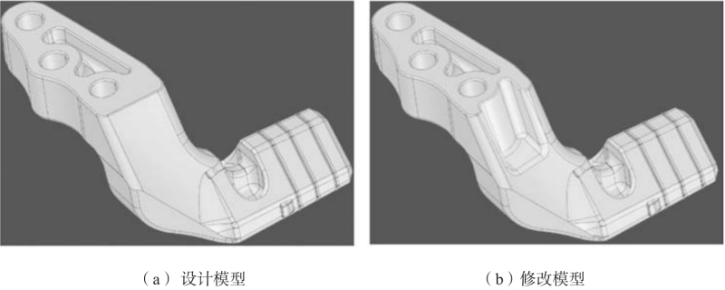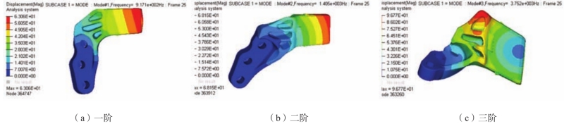 圖1 半固態支臂鑄件設計模型及修改模型 2、CAE計算分析 進行多輪CAE計算迭代。計算一階二級三級對地模態、極限工況米塞斯應力及最大主應力、以及典型工況米塞斯應力。 對地模態標準要求大于600 Hz,一階二級三級對地模態計算結果均達到了這個要求(圖2)。