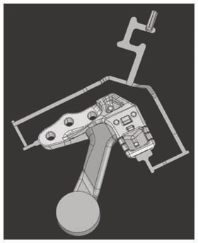 圖3 半固態支臂鑄件CAE計算 3、產品制造 3.1 工藝設計 鋁合金支臂半固態壓鑄澆注系統設計、溢流及排氣設計如圖4所示。澆注系統設計在鑄件彎形位置附近,內澆道較厚,有利于鑄件充型及補縮。溢流及排氣設計在距離鑄件中心位置較遠的兩端,兩端溢流排氣系統連接在一起向外排出。