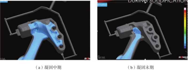 圖4 半固態壓鑄澆注系統、溢流及排氣設計 3.2 數值模擬 使用Sigmasoft Virtual Molding軟件對鋁合金支臂半固態壓鑄充型及凝固過程進行數值模擬,結果如圖5、圖6所示。